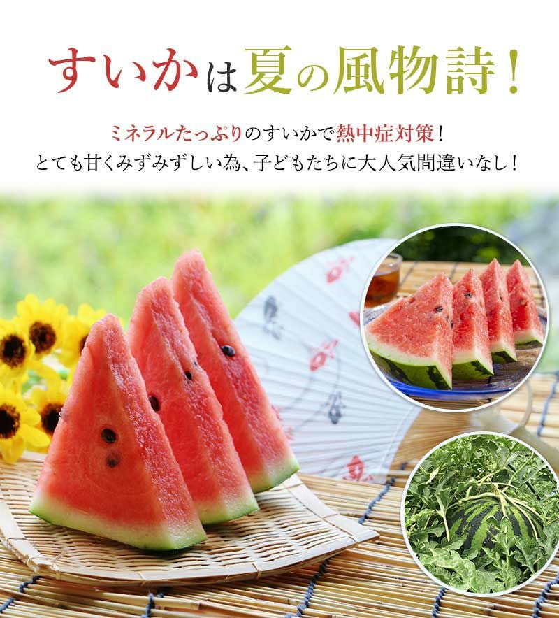 | 土づくりへのこだわり | 完熟すいかは、土が本来持っている「ちから」に注目し、化学合成肥料を慣行栽培に比べ8割減、殺虫剤を5割減に抑える栽培方法で栽培しています。1玉1玉丁寧に丹精込めて作っております。長野県の夏の味わいを是非ご堪能下さい。 |