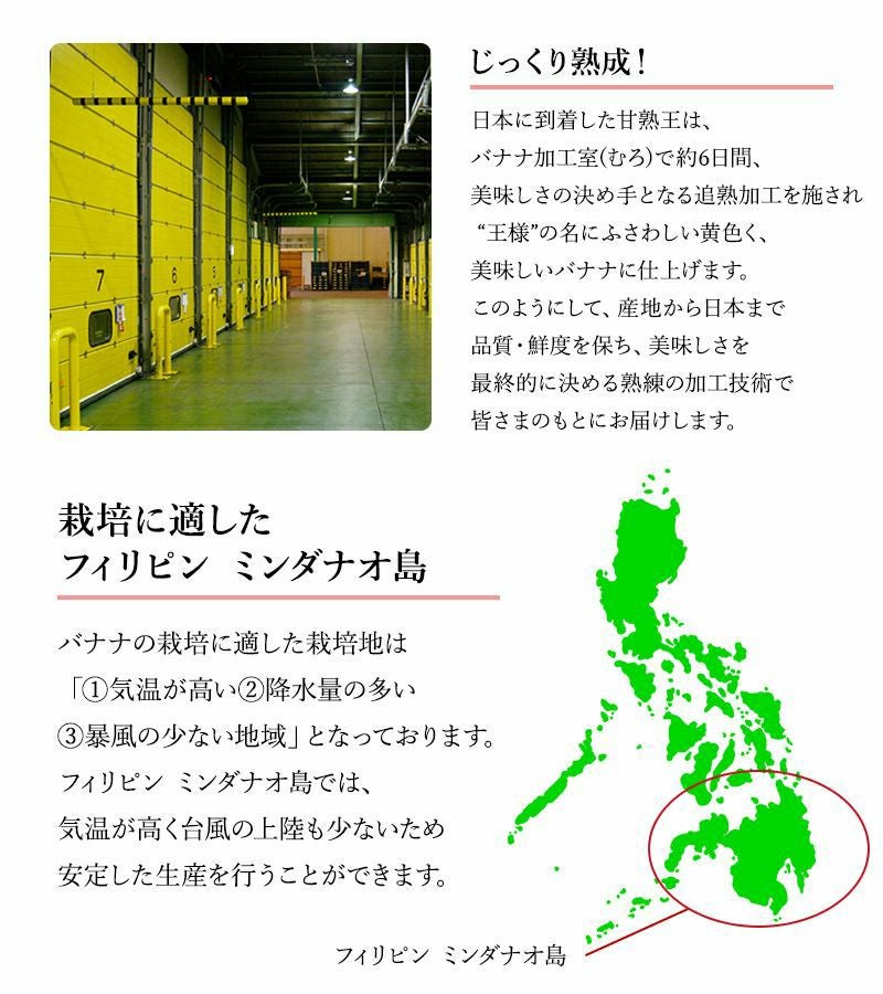 | じっくり熟成 | 日本に到着したバナナは、バナナ加工室(むろ)で約6日間、追熟加工を施され、黄色く美味しいバナナになります。 食味を最終的に決める加工技術で熟成した、甘くて美味しいバナナはこのようにして皆さまのもとにお届けします。 |