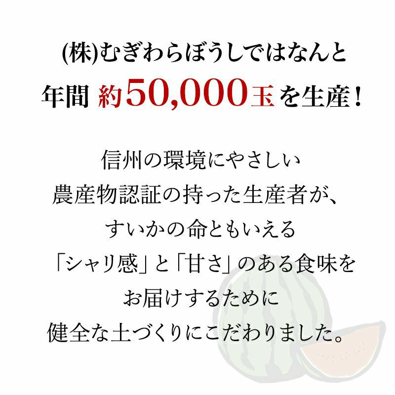 | むぎわらぼうしから産地直送 | 信州の環境にやさしい農産物認証の持った生産者が、すいかの命ともいえる「シャリ感」と「甘さ」のある食味をお届けするために健全な土づくりにこだわりました。昼夜の寒暖差がある標高700~800m前後の「完熟すいか」の畑は、内陸性気候で晴天率も高く、火山灰質の土壌は水はけがよく、すいかの栽培にとても適しています。 |