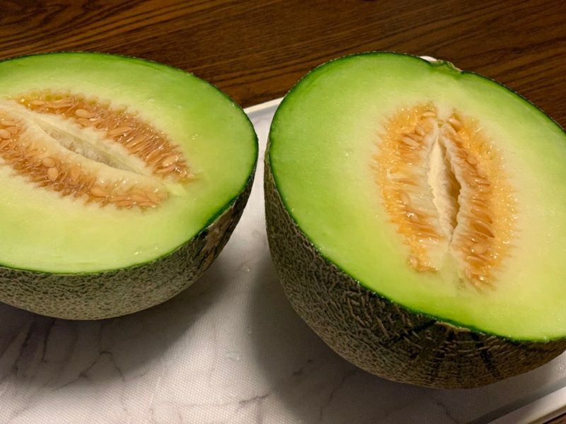 完熟した食べ頃のメロンを見極めるには、メロンのお尻(下の部分)を指でそっと押してください。少し弾力を感じるものが食べ頃の証しとなります。