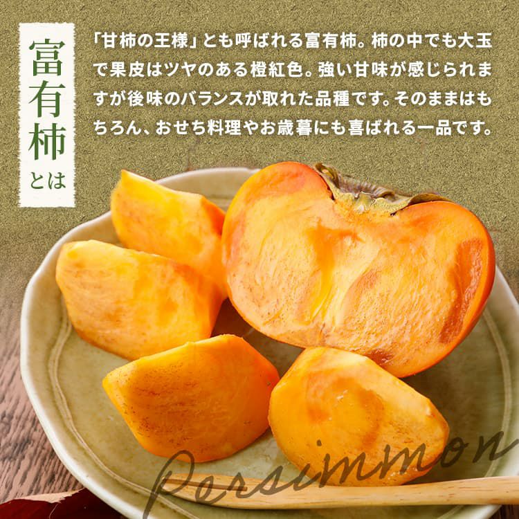 富有柿 | 「甘柿の王様」とも呼ばれる富有柿。 柿の中でも大玉で果皮はツヤのある橙紅色。強い甘味が感じられますが後味のバランスが取れた品種です。 |