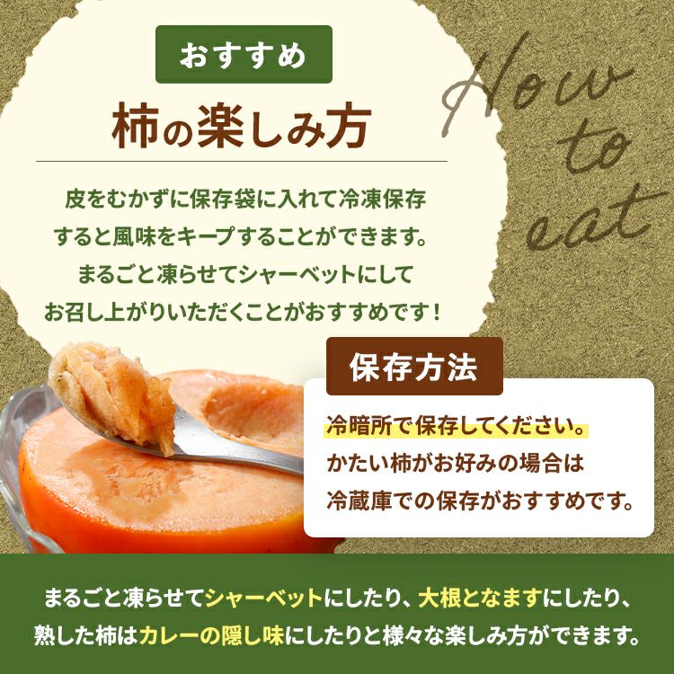 保存方法 | 冷暗所で保存してください。 かたい柿がお好みの場合は冷蔵庫での保存がおすすめです。 |